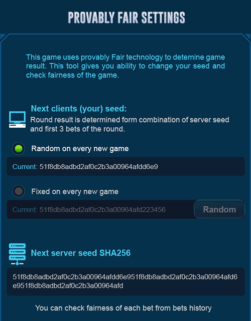 - To prove fairness, we will show the client seed and the random number before each round, so players can change their client seeds if they want.